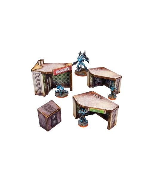 The Al Medinat Sabil Shops (4) PREPAINTED is a set of four small scatter / buildings, dedicated for Infinity the Game by Corvus Belli.