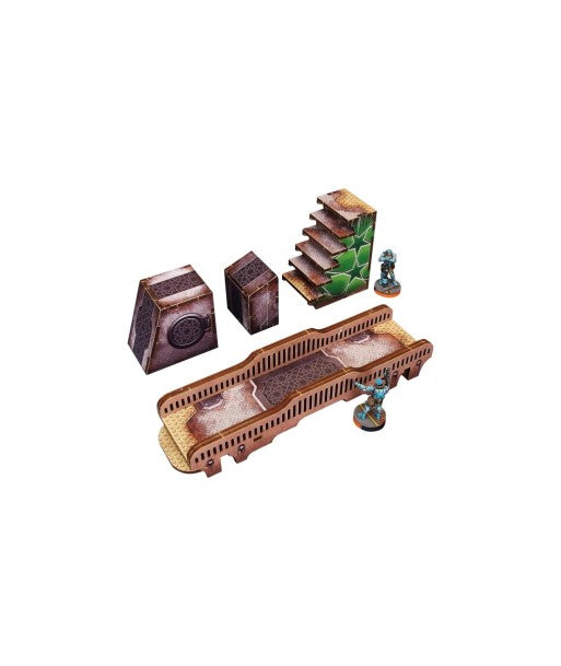 The Al Medinat Stairs and Bridge (4) PREPAINTED is a set containing a bridge, a stairs section and two angled boxes, dedicated for Infinity the Game by Corvus Belli.
