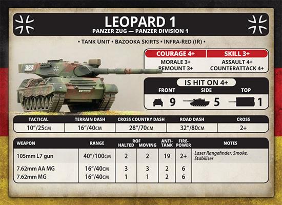 Contains 5 Leopard 1 tanks, crew sprue, units cards and decal sheet