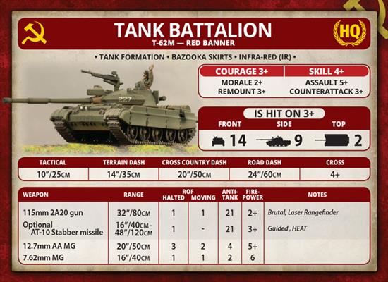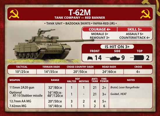 Contains: 5x Plastic T-62M Tanks, 1x Tank Commander Sprue, 1x Decal Sheets, 4x Unit Cards