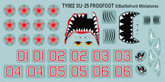 Includes two plastic SU-25 Frogfoot aircraft, two plastic flight stands, one decal sheet and one Unit Card.