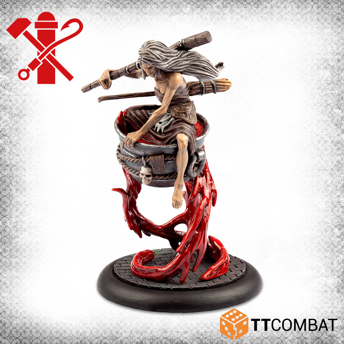 This set contains Baba-Yaga, the Guild's premiere answer to magic use in Carnevale. Floating into the fight on tendrils of blood, her magical ability is not to be questioned! With the Blood Rights command ability she sees your other gang members' blood as her rightful possession, and will take it from them by force, replenishing her own Will Points! If her magic doesn't get your enemies, her massive pestle surely will.