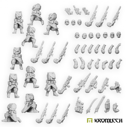 This set contains one Desert Raiders Infantry Squad consisting of ten miniatures: nine Desert Raiders Guardsmen and one Sergeant. Heads and bodies have unique designs. Various anti-vehicle and anti-infantry weapons included along with comms backpack.