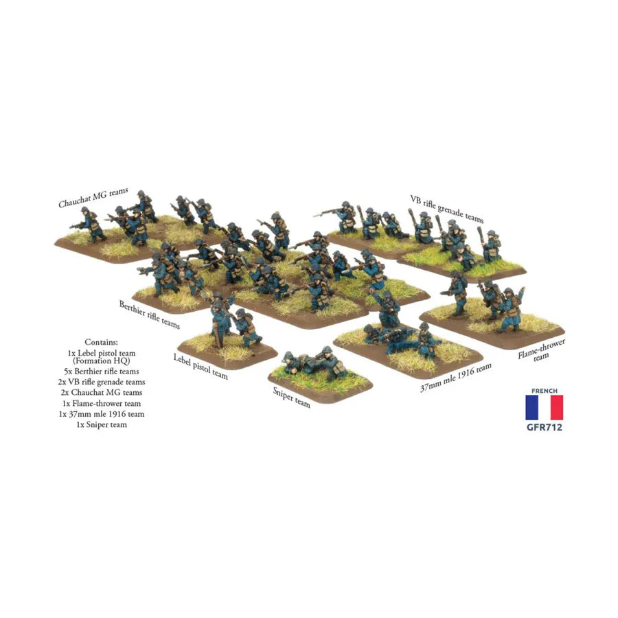 The sharp end of the French fighting force is the riflemen, or Fusiliers, much the same as it was in the days of Napoleon. Supported by Chauchat light machine-guns and Vivien and Bessières rifle grenades, the Fusiliers can handle any challenge in the attack or on the defense. When they close in on the enemy the preferred weapon is the bayonet.
