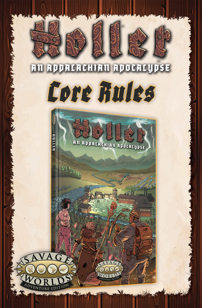 Holler is a roleplaying game of adventure, rebellion, fairy tale, and gothic horror in Appalachia. It'll take miners, granny women, gougers, moonshiners, bluegrass pickers, and holy rollers willing to fight and die to protect their culture, customs, and families. The Holler: An Appalachian Apocalypse for Savage Worlds roleplaying game core book is a 256 page, full-color hardcover in the same graphic novel size as all our Savage Settings.