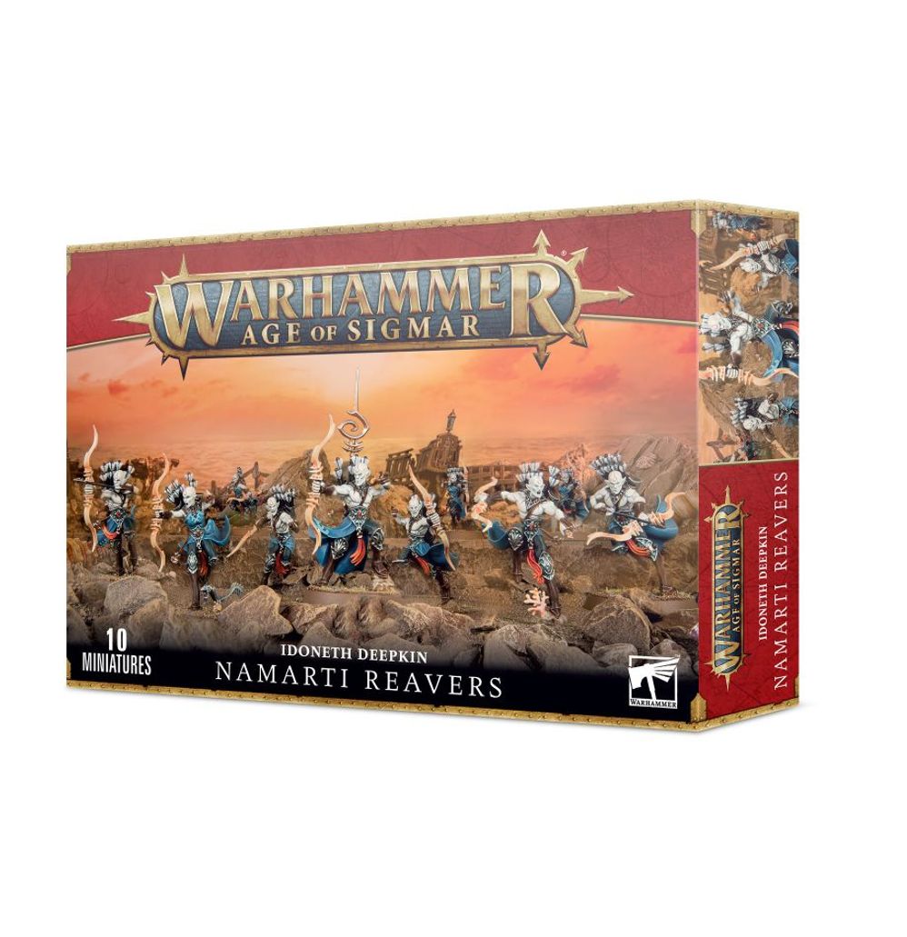 This multi-part plastic kit contains the components necessary to assemble 10 Namarti Reavers. Clad in less-ornate armour than their commanders and superiors, as befits their withering souls and disposable nature, they still cut impressive figures – each is powerful and muscular. 10 heads are included, which are interchangeable – each is hairless and blind, with blank, empty sockets where eyes should be. There are choices in the way you can depict them – 10 pairs of arms holding whisperbows are included, each specific to a torso, with a further 10 alternative pairs holding whisperbows and keening knives. There are options for an icon bearer – this model is distinguished by their back banner, a huge wrought Idoneth Thrall rune which towers over them from behind. Included is a decorative component for one of the bases – a long, sinuous eel with bared fangs and a distended jaw, ready to strike.
