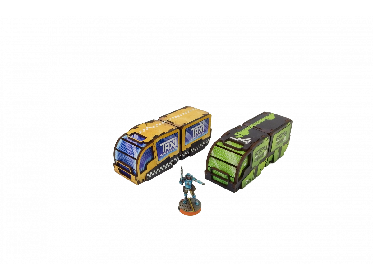 The Precinct Sigma Pepinillo Vans PREPAINTED set consists of one van and one trailer. It can be assembled in various ways and used as an articulated vehicle or single van and pods.