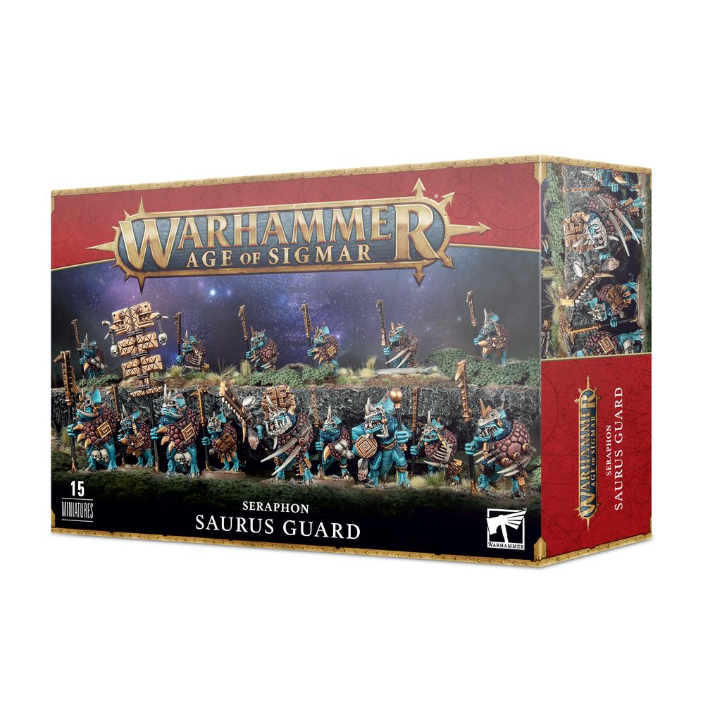This multipart plastic kit builds 15 Saurus Guard – dedicated defenders of the Seraphon leadership. These elite warriors wield spiked celestite polearms, clad in ornate armour to supplement their natural scaly skin. The kit includes loads of options to personalise your Saurus Guard – all of the bodies, legs, polearms, and shields are interchangeable, with nine different head designs you can use on any Guard, and plenty of jaw-guard accessories. The kit also includes parts to build a Saurus Guard Alpha champion with a unique polearm, shield, and headdress, a War-drummer musician, and an Icon Bearer with a choice of three banner tops.