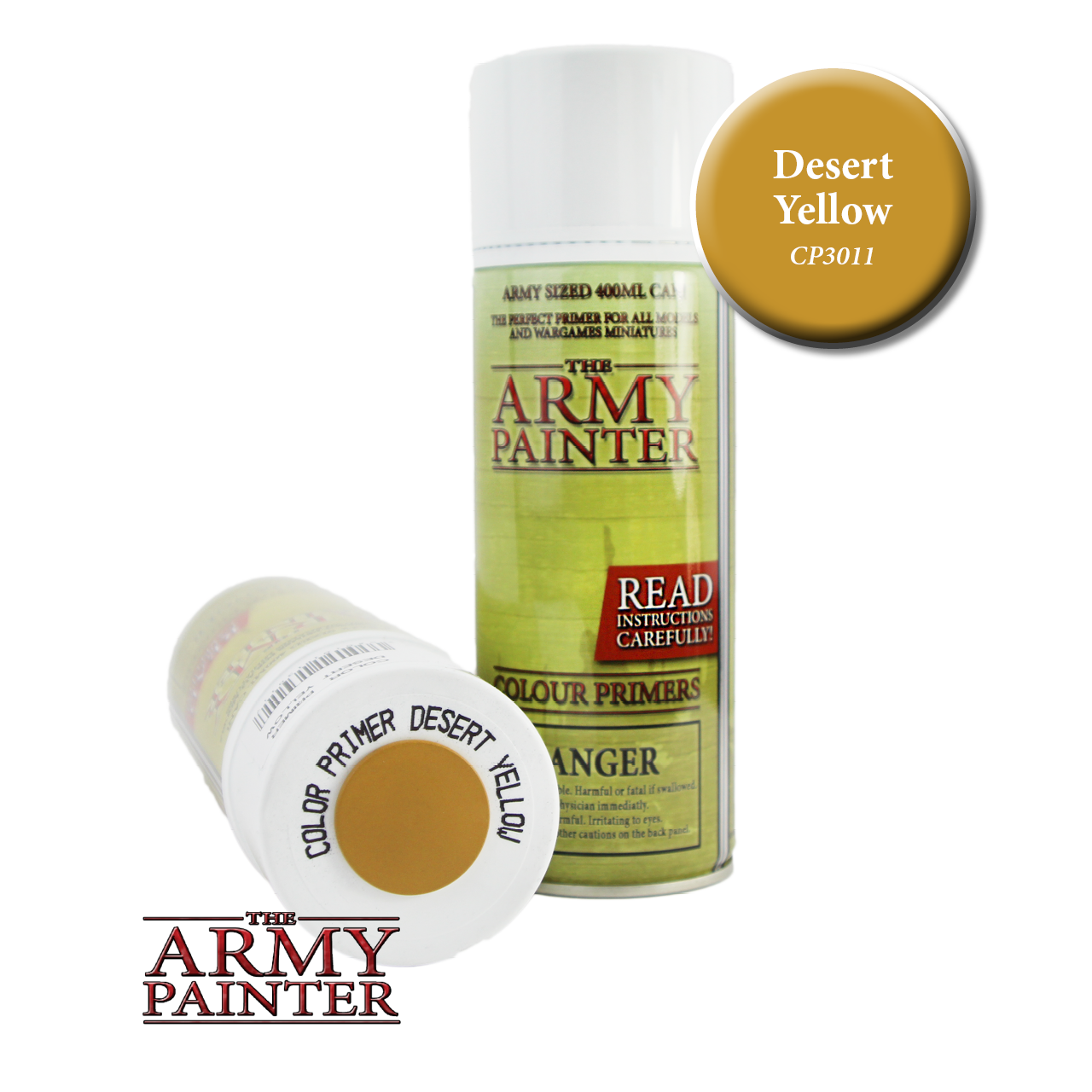 Desert Yellow: A Colour Primer originally designed for WWII desert vehicles and uniforms. This spray is also very popular for scenery, horses, wolves and even light wood on warmachines and chariots.