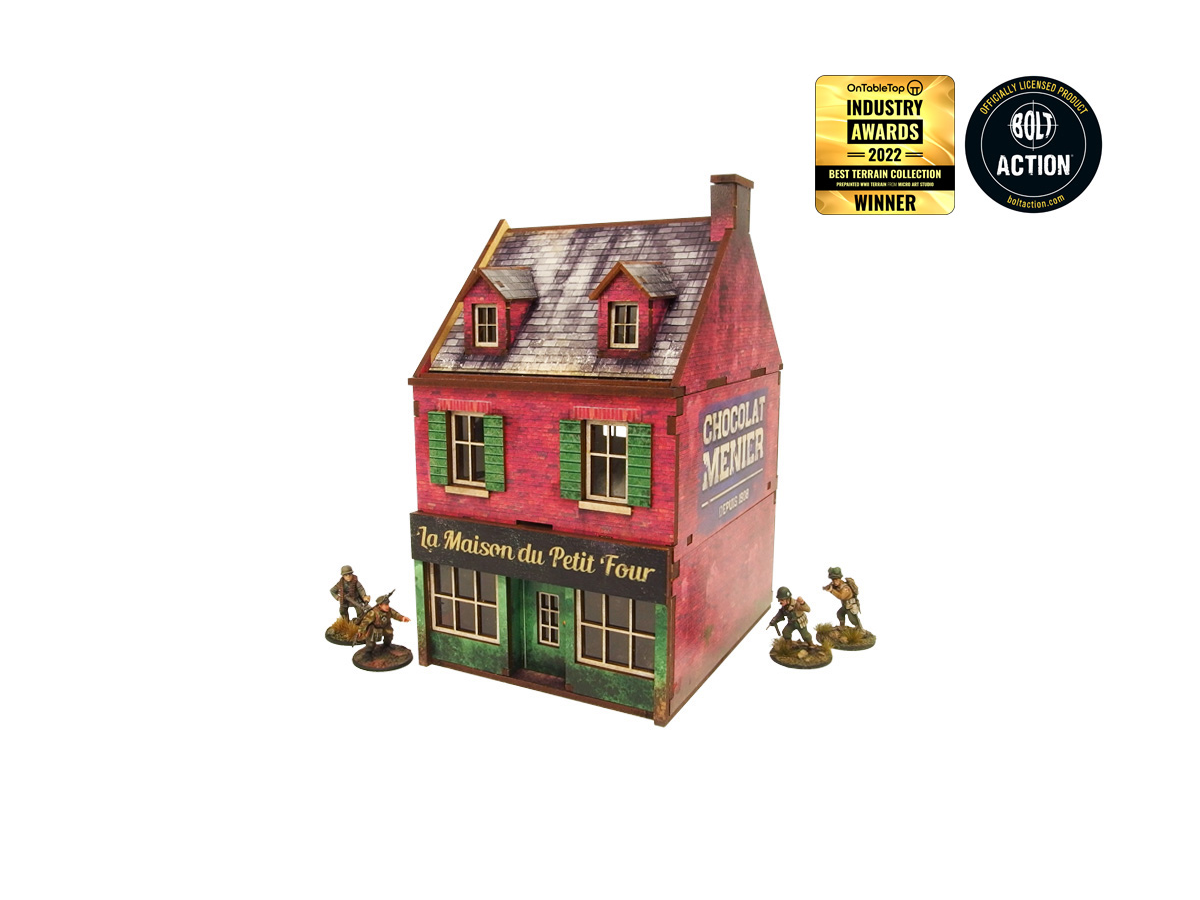 Multicolor prepainted (UV-printed) 3-level WW2 Normandy Cafe building with accessible colorful interiors, removable levels and removable ruined ground floor. Room to fit in the whole infantry squad inside. Pre-cut acrylic transparent window panes included. Option to assemble with open or closed shutters and doors. Optional signboard included.