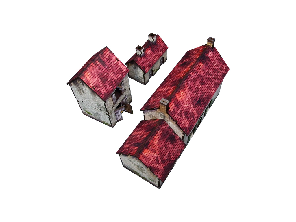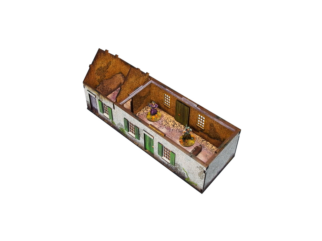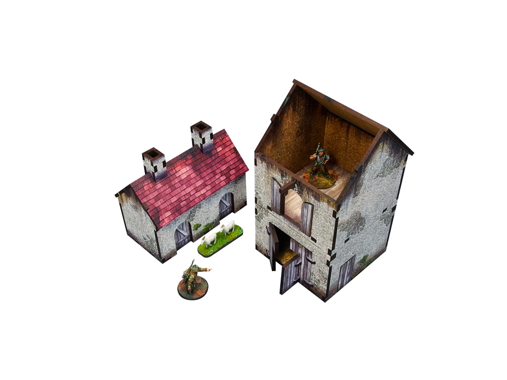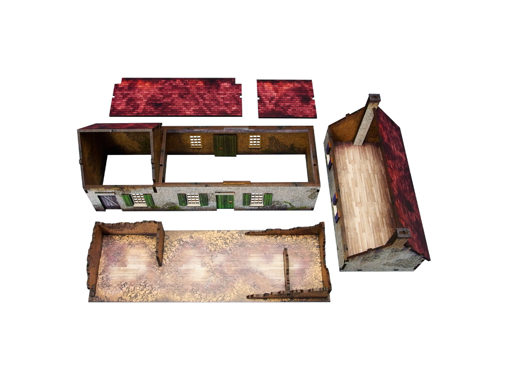 A set of 3 multicolor prepainted (UV-printed) WW2 Normandy Homestead buildings with accessible colorful interior, removable levels and removable ruined ground floor of the main building. Room to fit in the whole infantry squad inside. Pre-cut acrylic transparent window panes included. Option to assemble with open or closed shutters and doors.