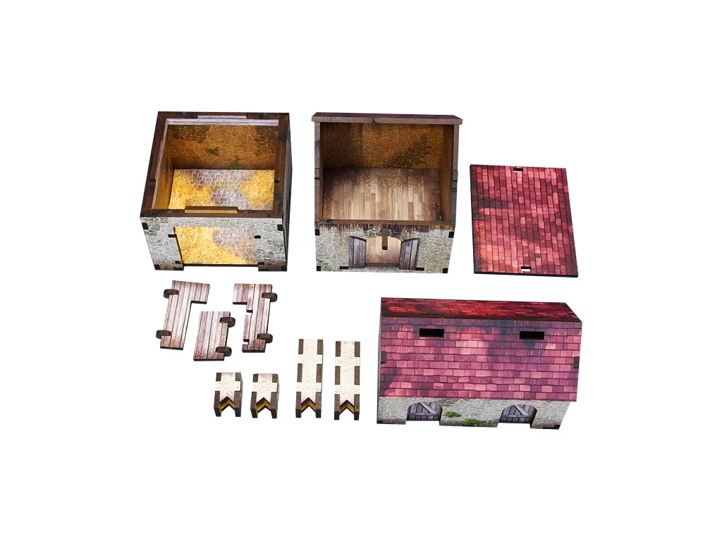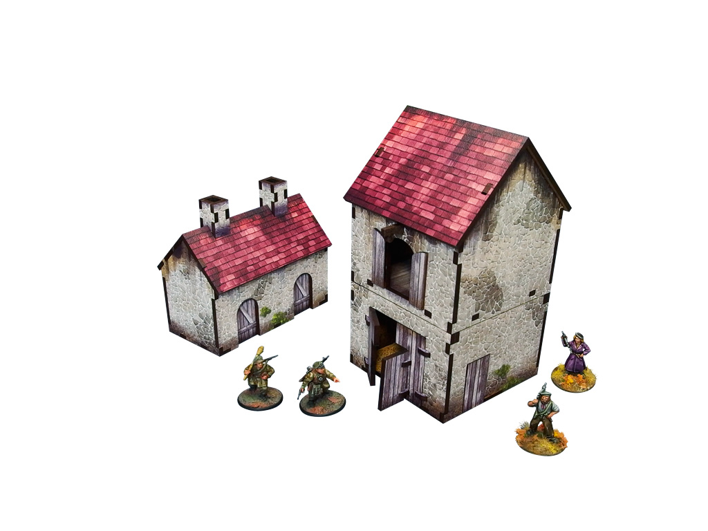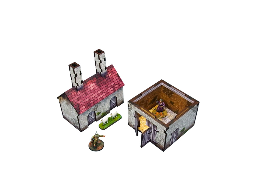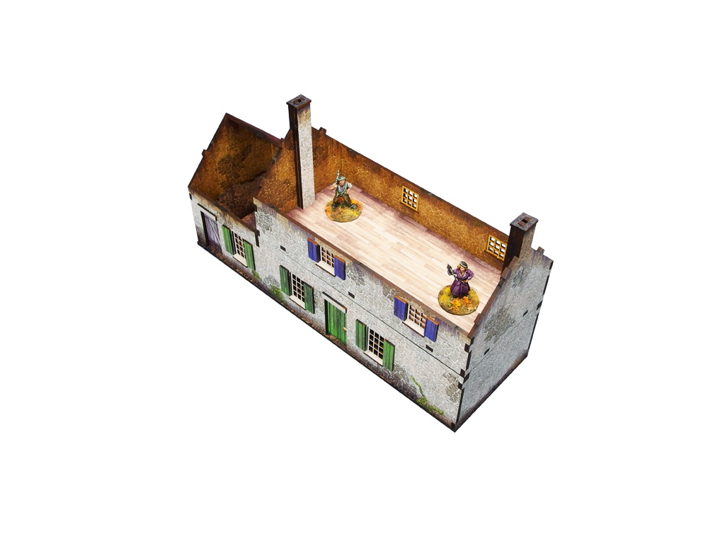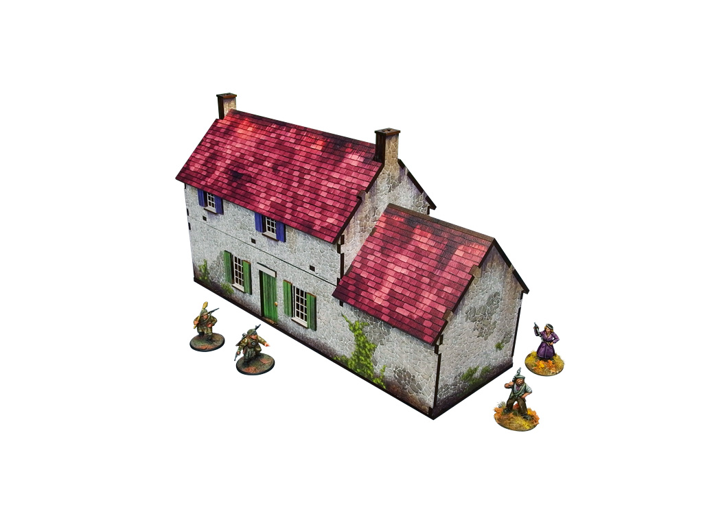 A set of 3 multicolor prepainted (UV-printed) WW2 Normandy Homestead buildings with accessible colorful interior, removable levels and removable ruined ground floor of the main building. Room to fit in the whole infantry squad inside. Pre-cut acrylic transparent window panes included. Option to assemble with open or closed shutters and doors.