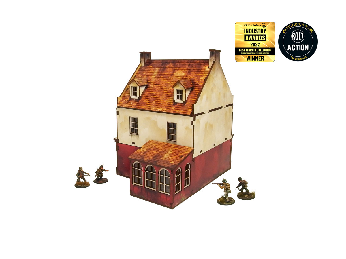 Multicolor prepainted (UV-printed) 3-level WW2 Normandy Restaurant building with accessible colorful interiors, removable levels and removable ruined ground floor. Room to fit in the whole infantry squad inside. Pre-cut acrylic transparent window panes included. Option to assemble with open or closed doors.